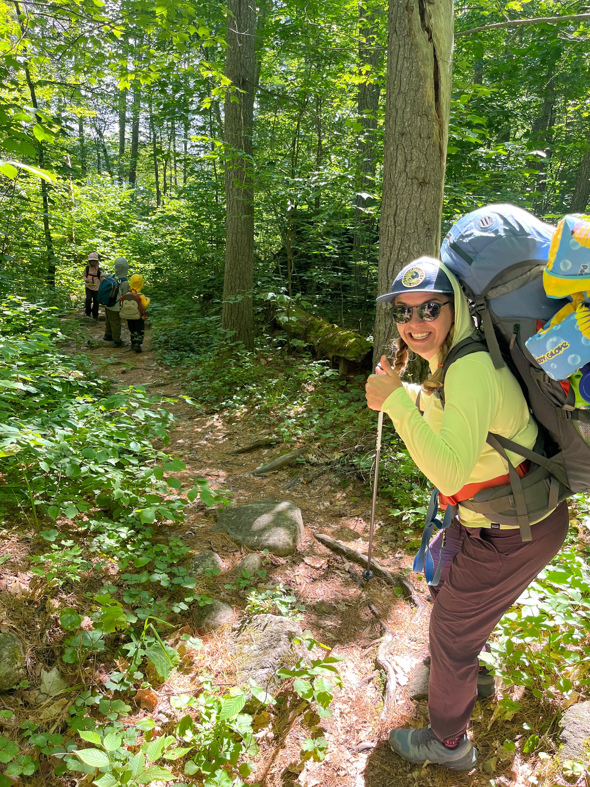 With everything re-attached and stowed in its travelling compartment we did one last round of bathroom stops, dosed in DEET, put up the hoods on the sunshirts, 4/5 of us opted for bug nets and we headed back up the trail to head back towards the truck, parked at the Achray Campground. The hike out was just as buggy as the way in, so we silently agreed that there would be no stopping, this would be a challenge for the kids, but leave them happier in the end.