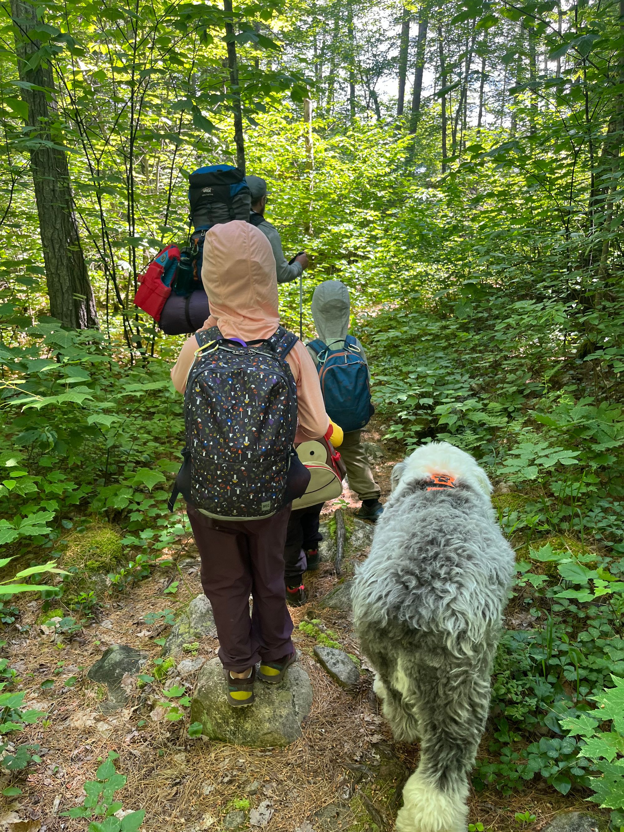 Goose sleeps with us in the tent. He has an assigned spot in the Tetris-like layout that is the inside of the tent. We are strategic about where everyone sleeps in the tent and have switched to a simpler sleeping bag/person arrangement instead of the family-style beds we were making before. We all have our own Thermarest pads with the exception of Frank who has like pad/mattress hybrid. I plan to create a post about a gear in the future! When we car camp our senior dog, Monte, also comes along - as long as its not too rugged. He sat this trip out as the hike would have been too much for him to do comfortably.