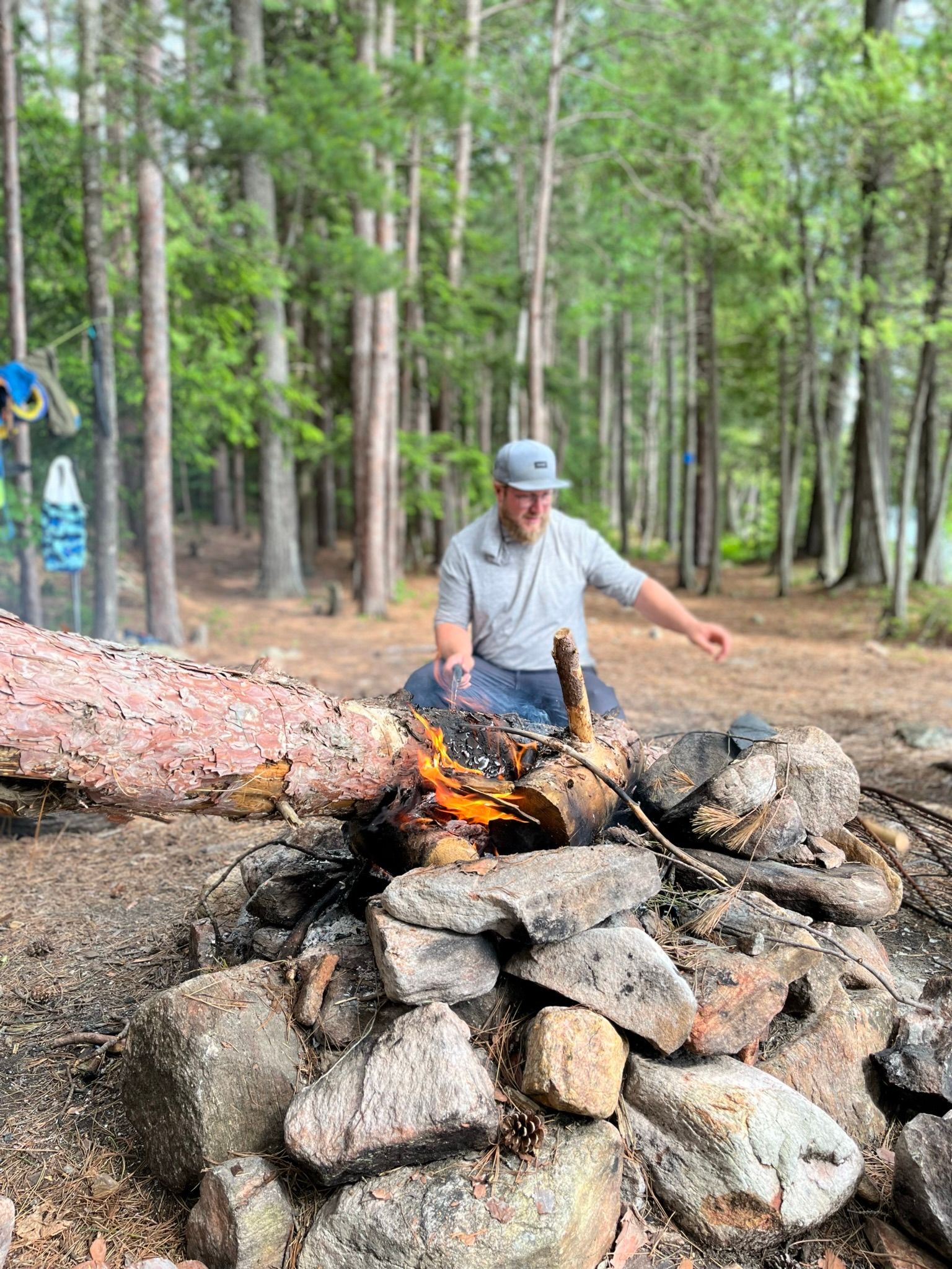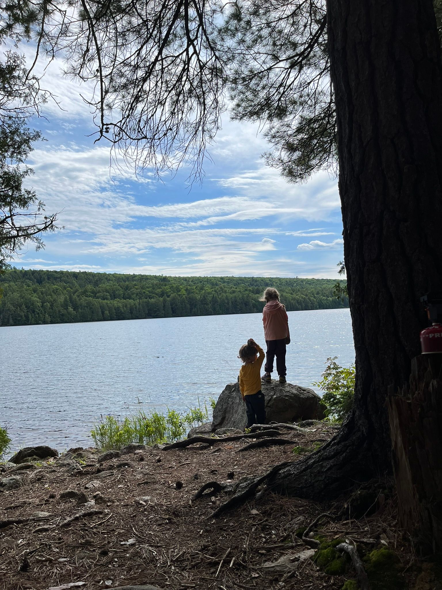 The campfire is partially sheltered by the trees but there is a nice breeze that comes in off the lake to help blow the mosquitoes away. There are rocks scattered around camp, if you, like us, decided against bringing chairs. We have identified this as a key error in our planning. Having a place to park your butt after a good stretch on the trail is important. Rocks and pine needle beds just don't cut it for us. The kids, sure, but the parents will certainly be carrying their chairs from now on. I purchased a set of MEC Ultra Light chairs just after we returned from the trip. Look for future reviews!